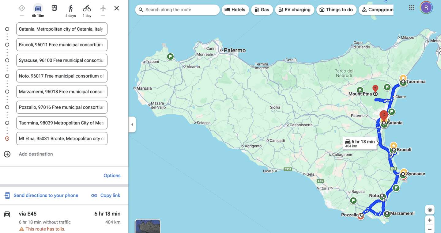 Renting a car in Sicily allows you to explore the island’s stunning landscapes at your own pace. In my opinion, renting a car is a must. Luckily this is very easy from the Catania or Palermo airports. You’ll have easy access to remote beaches, charming villages and historic sites often off the beaten path. Public transportation can be limited, so a car ensures you won’t miss out on any hidden gems. Plus, driving through Sicily allows you to experience the breathtaking views of its countryside and coastline firsthand. My itinerary below leaves you with the highlights of a southeastern Sicily road trip. Car pick up and drop off for this route are both at the Catania airport.