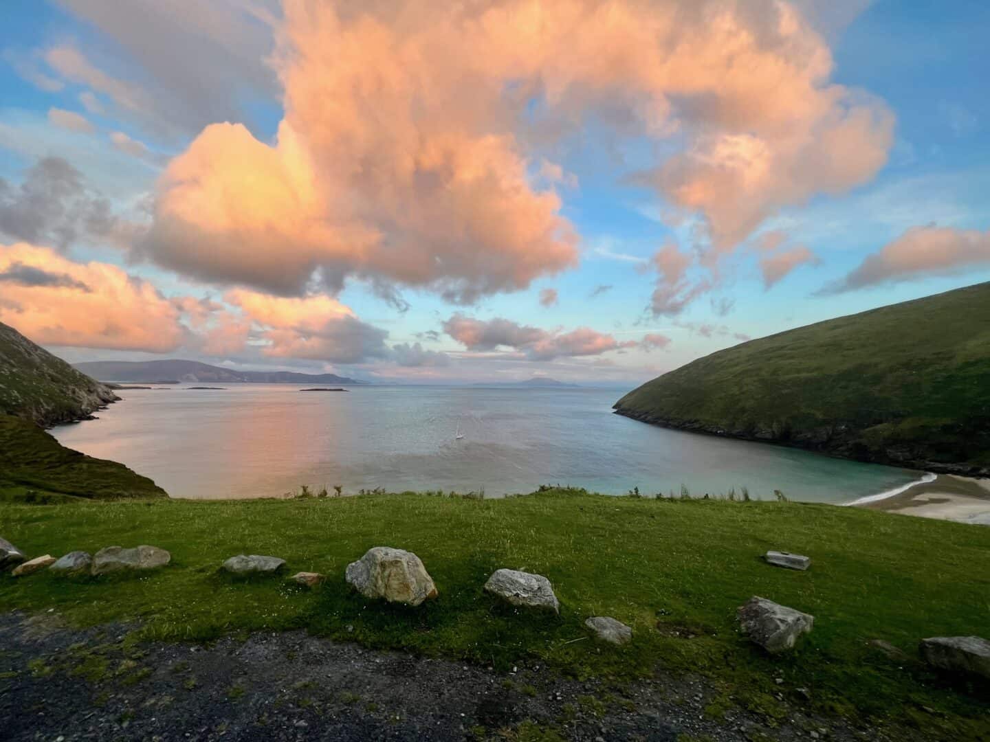 Keem Beach stands as one of the most other worldly beaches I have traveled to. With its pristine golden sands, gentle waves and crystal-clear waters, it’s no wonder this hidden gem has earned its place among the world’s top-rated beaches. Time stood still this evening as we witnessed a pink sunset of a lifetime with curious sheep grazing and barely another soul in site. Keem’s location, in a quaint cove is perfect for soaking up sun or braving a cold plunge in the chilly Atlantic waters. We hit the jackpot this evening with the yummy dinner at Amethyst paired with a majestic beach sunset. These lovely recommendations came from the delightful folks at Lavelles Seaside House where we enjoyed a down home B&B stay. Achill Island set a high bar for the rest of our trip.